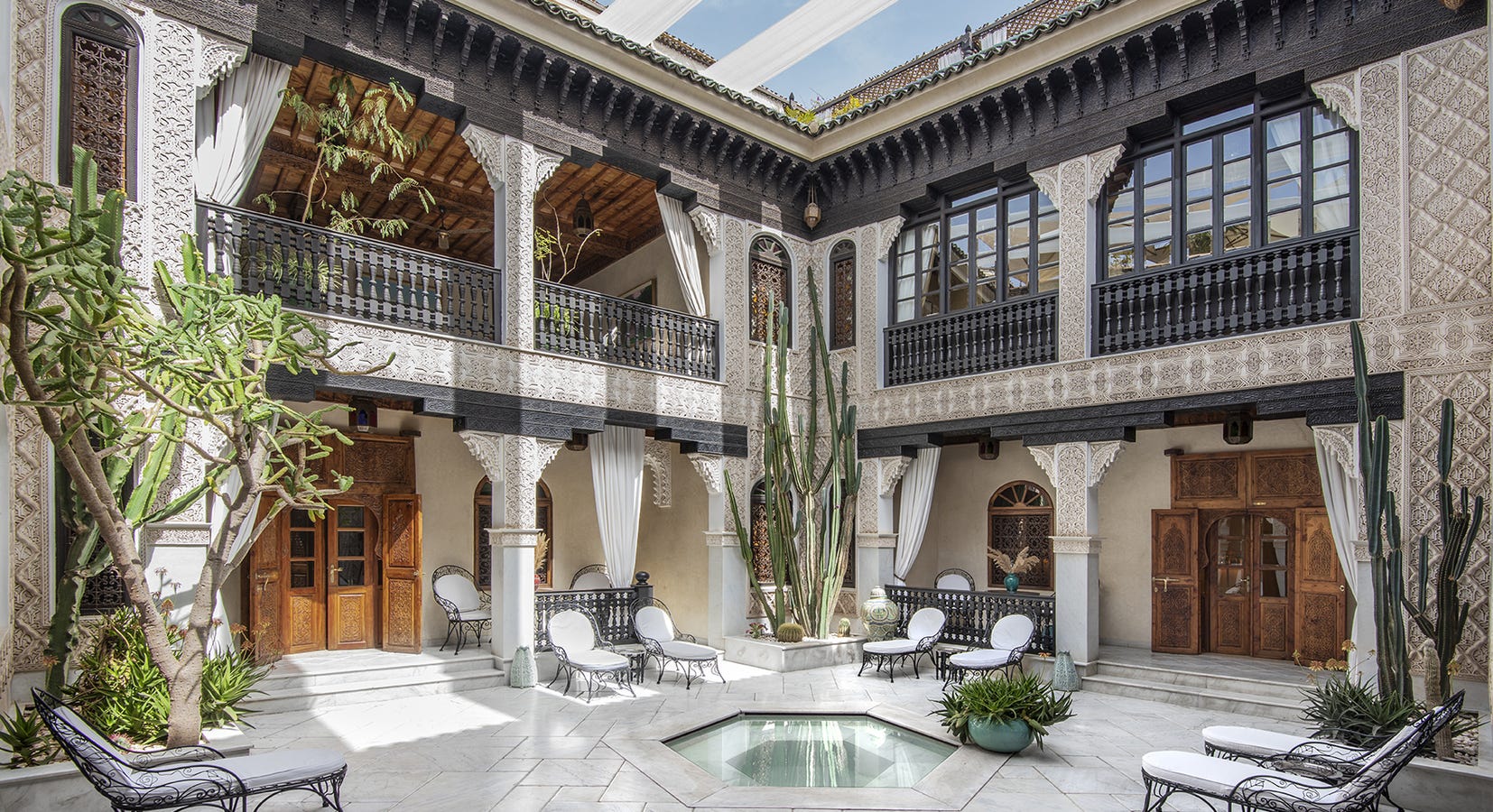 An adults-only riad in Dar el Bacha with three tranquil courtyards, ten refined rooms and suites, a heated courtyard pool and a petite rooftop plunge pool. Les Bains de
